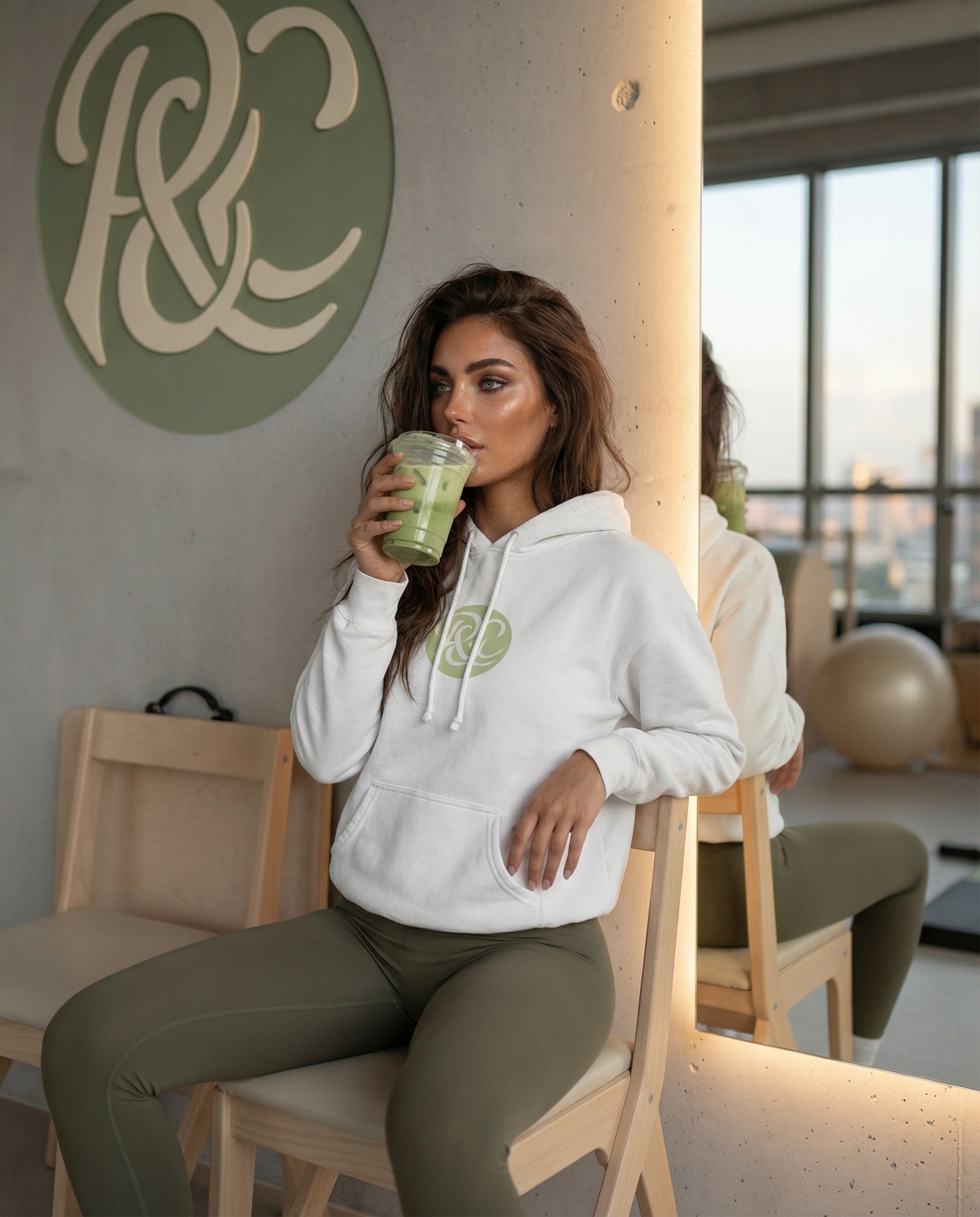 The Pilates & Caffeine Signature Hoodie blends premium comfort with a clean, minimalist aesthetic. Crafted from a soft, structured cotton blend and finished in timeless White and Sand tones, it’s the layer you reach for before coffee, after class, and everywhere in between.